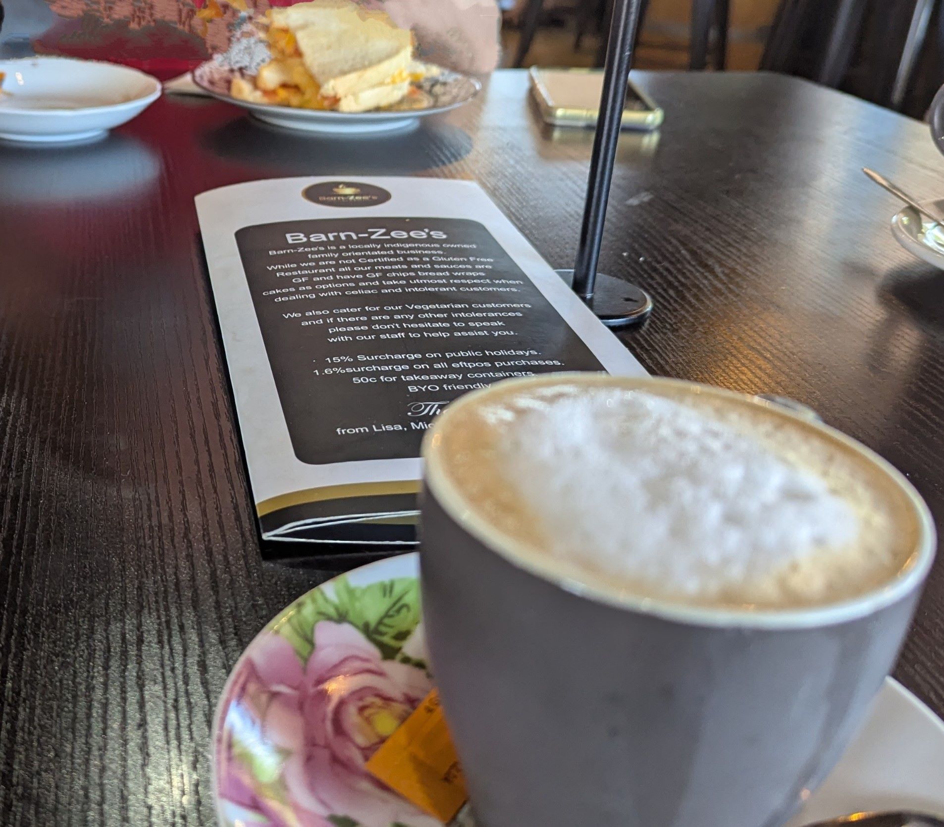 Barn- Zee is a successful – not only is the food delicious but the staff are friendly and efficient – indigenous owned and operated cafe. We had coffees, a toasted sandwich with beautifully melted cheese, and vanilla slices. The last were too tempting. I am glad that I do not live nearby.