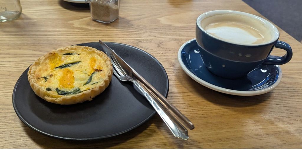 This was a mixed experience. The quiches and toasties were pleasant and the coffees good. However, a badly heated pie (the recipient’s first for forty years) was a disappointment.