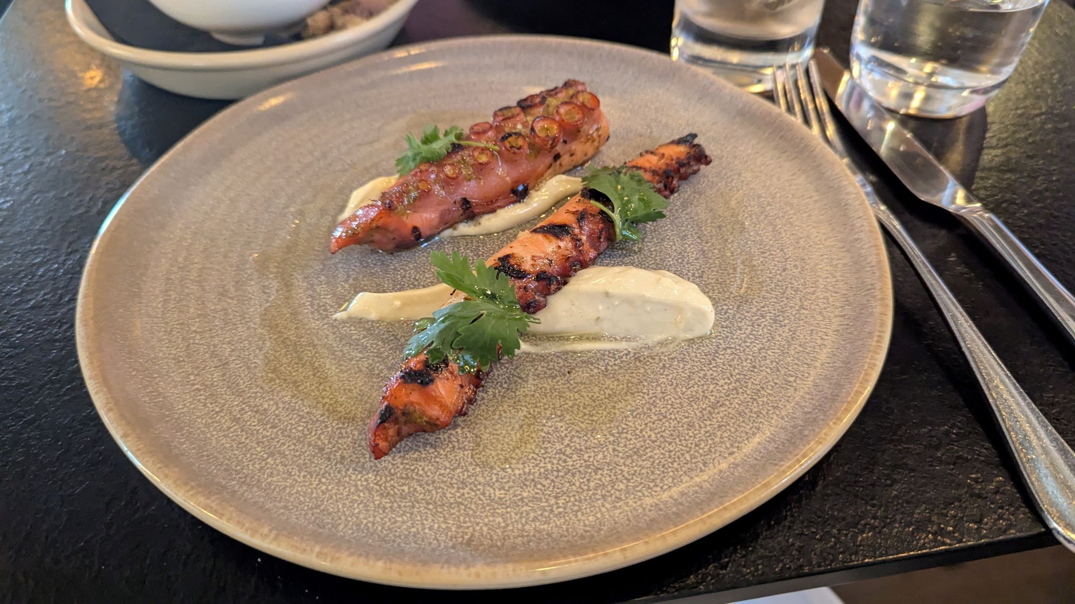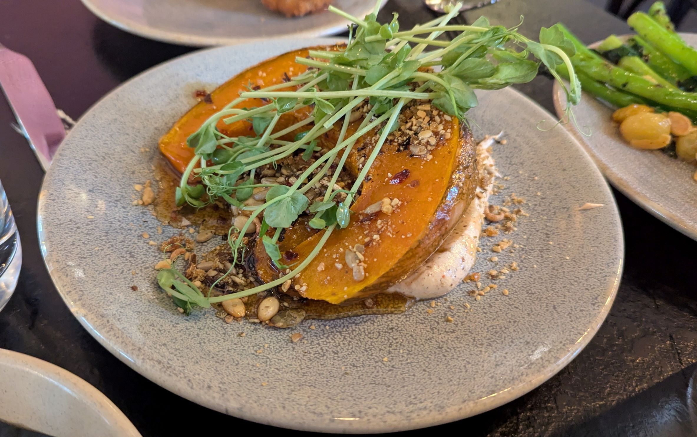 The food was delicious, starting with olives, fetta and warm bread with a whipped flavoured butter. We then had octopus- marinaded with chili and other ingredients, so the chili was delicate rather than overwhelming and ham hock croquettes, roast pumpkin and broccolini. The atmosphere was casual and friendly, with people ordering by choice, rather than adhering to entree, main etc. Next to us two oysters, followed by chicken was ordered. On the other side, more oysters, a ceviche and roast pumpkin. The noisy men, further afield, went through the whole menu probably. We left before they would have ordered dessert.