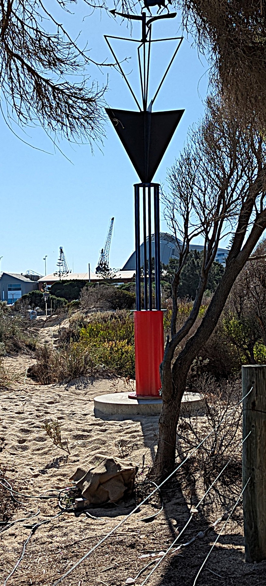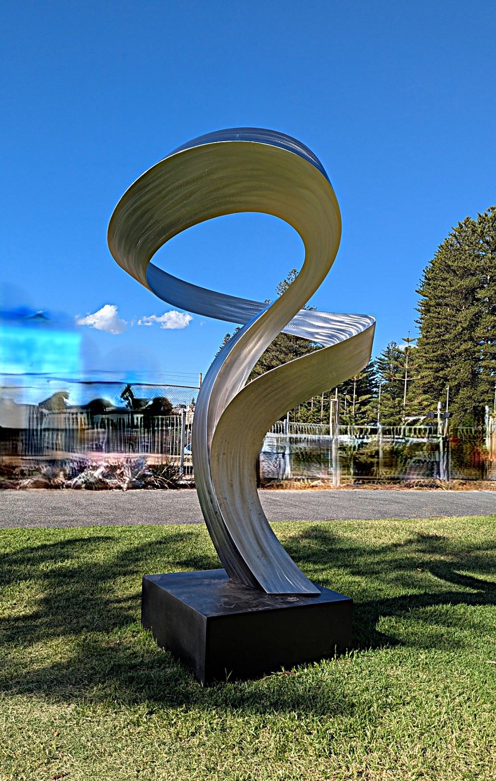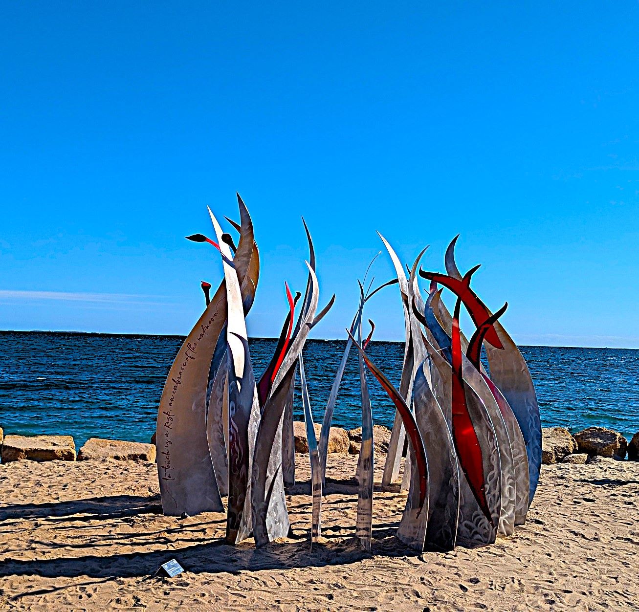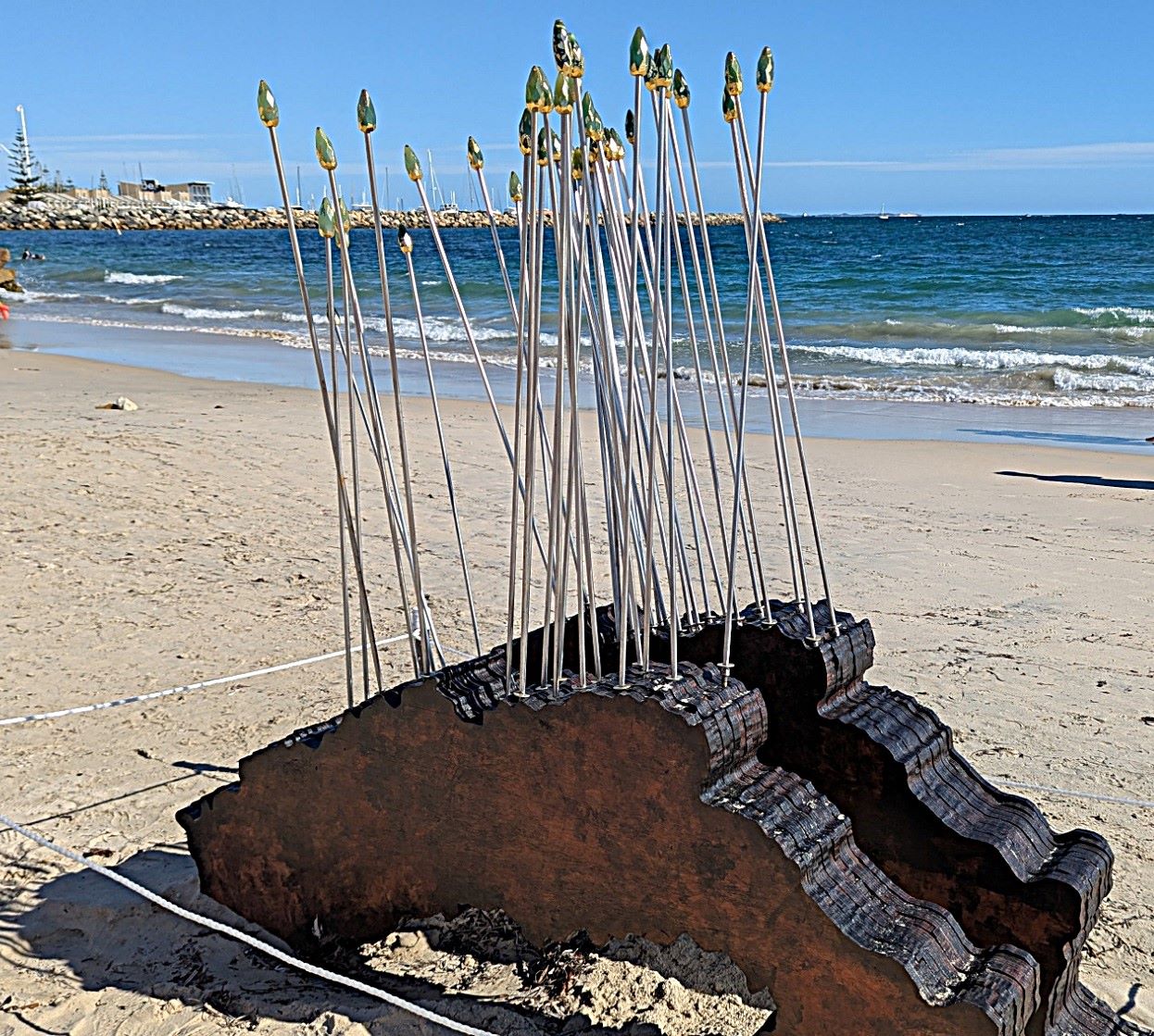 Sculptures pictured above are: Alan Seymour – Nyaung-gan; Tony Jones – Rottnest Blues; Sakura Motomura – Dazzle; Melanie Maclou – Ocean Dancer: crimson allure; MM- OD; Johannes Pannekoek – Elegy in Motion 1; Mandy Hawkehead – Intonation (musical sound tubes, depicting an ocean melody); Sam Hopkins – Beyond the surface.