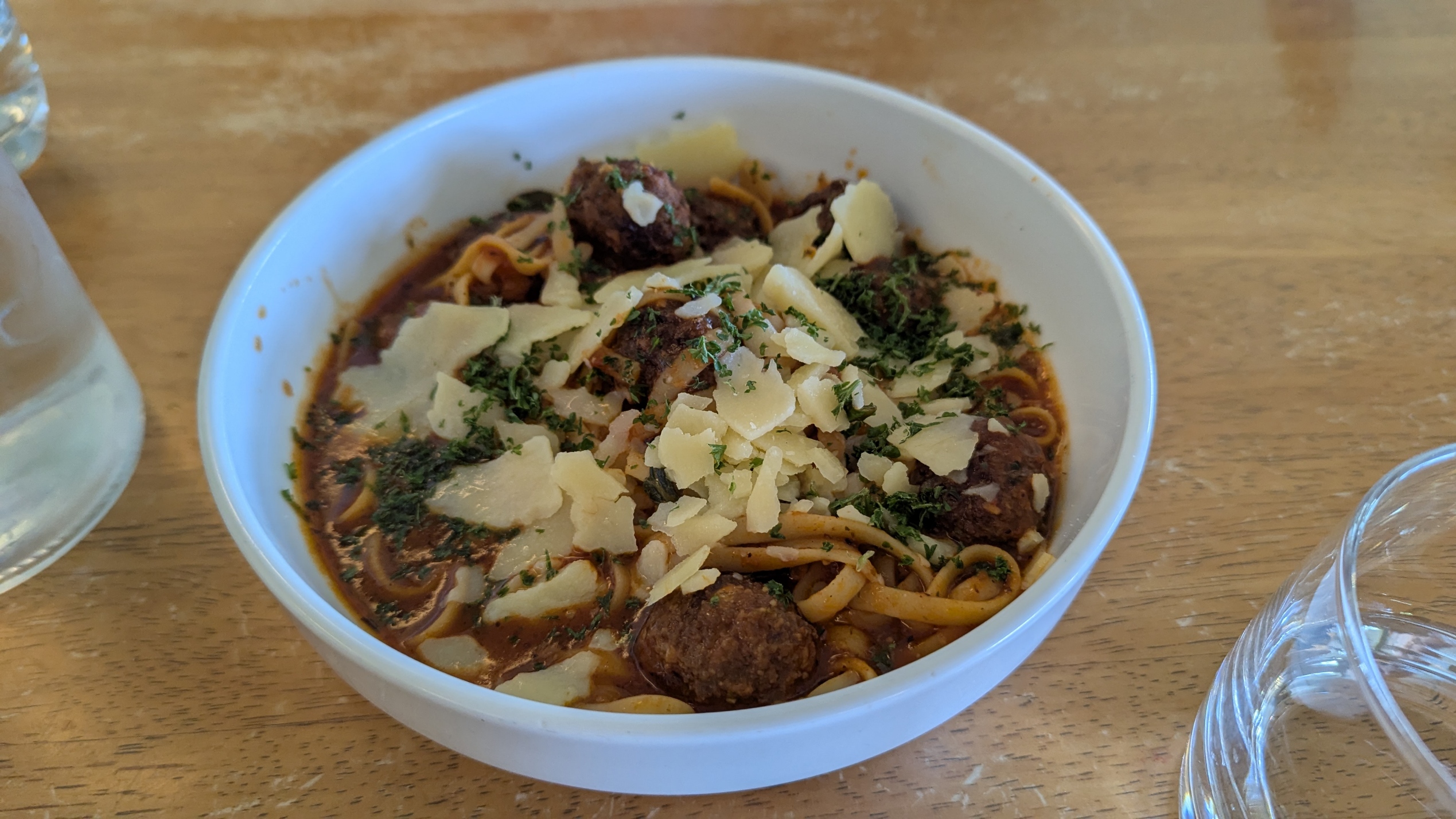 We had some delicious pastas- the special, chicken Carbonara (the request for chili was agreed immediately and the portion provided, generous); spaghetti and meat balls; and spaghetti, garlic and prawns (the request to omit the chili was granted without fuss). This is a friendly restaurant, in a lovely location, with a good menu and readiness to meet customers’ requests that is exemplary. The wagtail was a bonus.