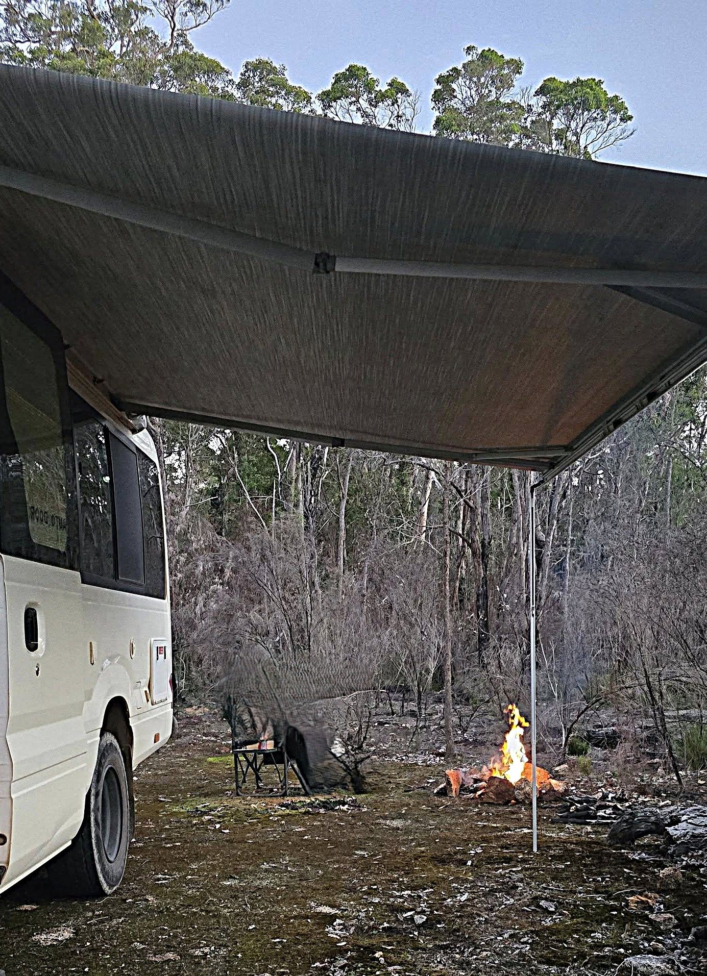 Planned to camp at Crossing Point but one grumpy pair there already so we found a spot off a side road off another side road and cooked over a fire – yes the weather has turned, and just before I get to Elephant Rocks – grrr.