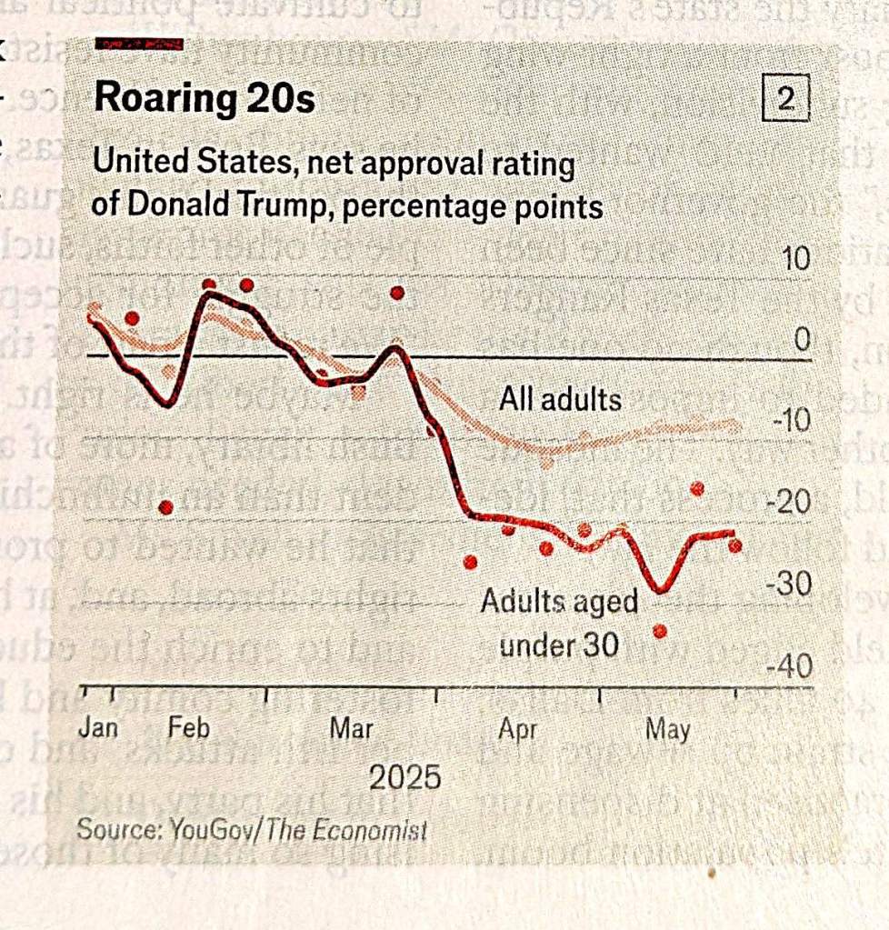 The good news for Democrats is ‘that millennial and GenZ voters appear persuadable. Already, data from YouGov/The Economist show that many of the gains Mr Trump made for his party amongst the youngest voters have begun to diminish…the president’s net approval has fallen by around 13 points nationwide. Among the undr-30s it has plunged 25 points, from net positive to a net negative 21. See graphic below: