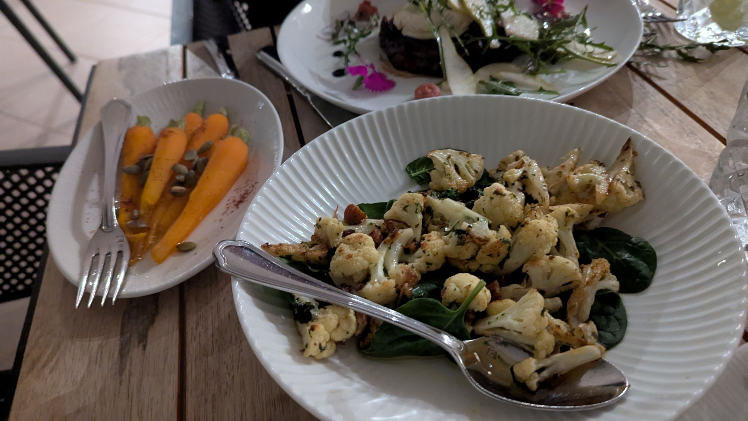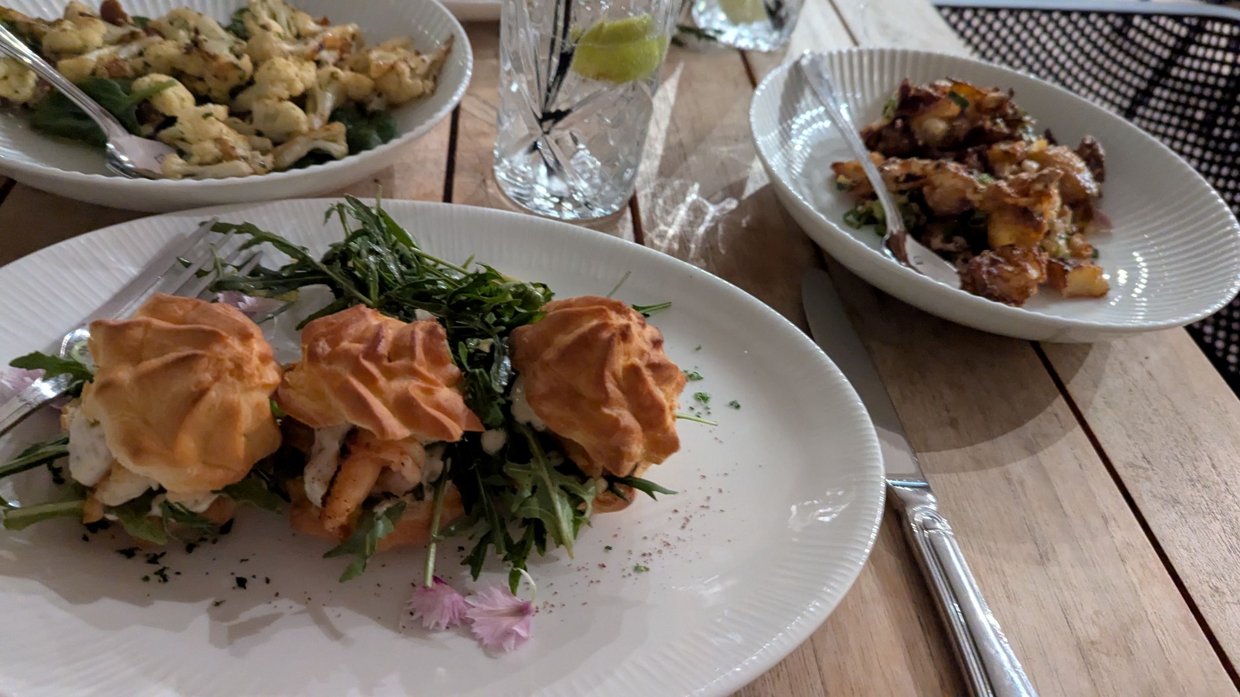 Bird Rock at the Mercure has an elegant menu which we enjoyed in the outside dog friendly section. Although there are delicious main courses, we chose a tapas menu of onion tart, roasted cauliflower, patatas bravas, prawn profiteroles, sour dough, rocket and pear salad and oysters. Delicious!