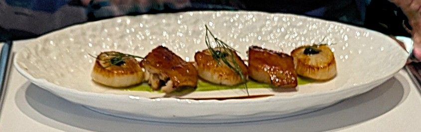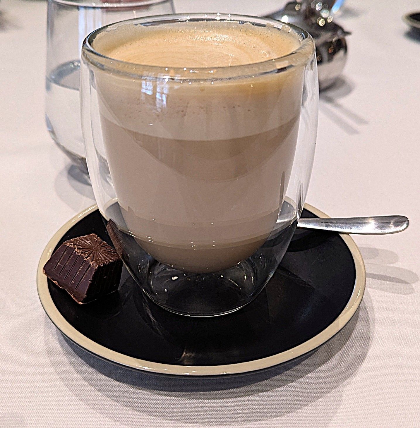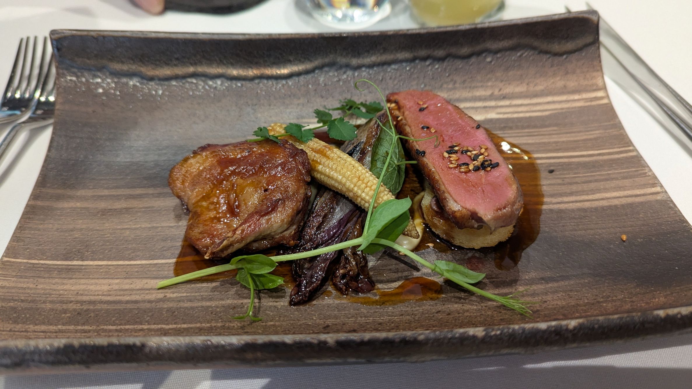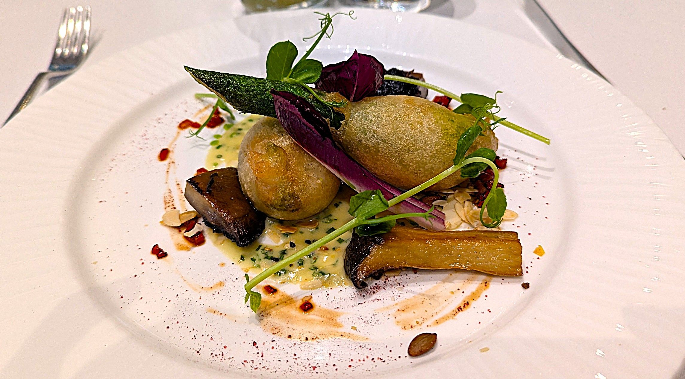 The ash butter and rolls is one of my favourites – and we given a serve of butter each. Then to entrees – the duck and quail, scallops, and tomato and burrata were delicious. With our main course – stuffed courgette blossoms and mushrooms for the three of us – we were served a complimentary pureed potato side. Forgoing dessert was easy, as the coffees arrived with a chocolate, and then came the birthday treat of berries, gelato and mousse.