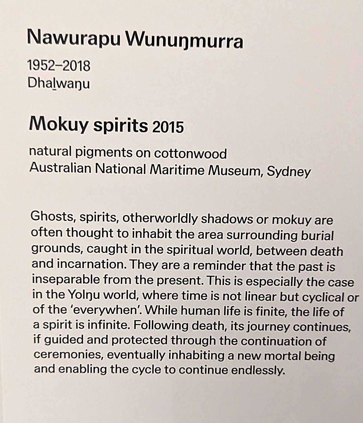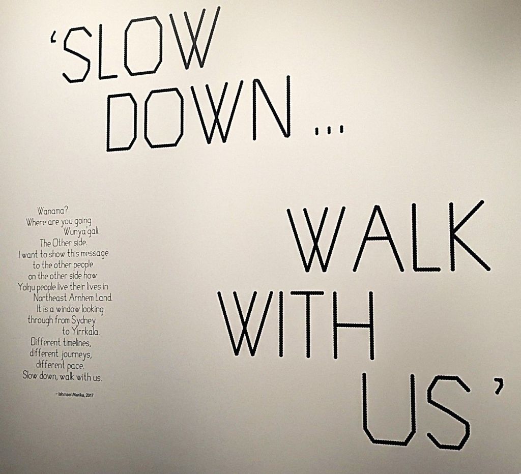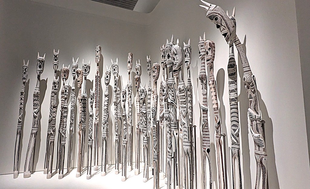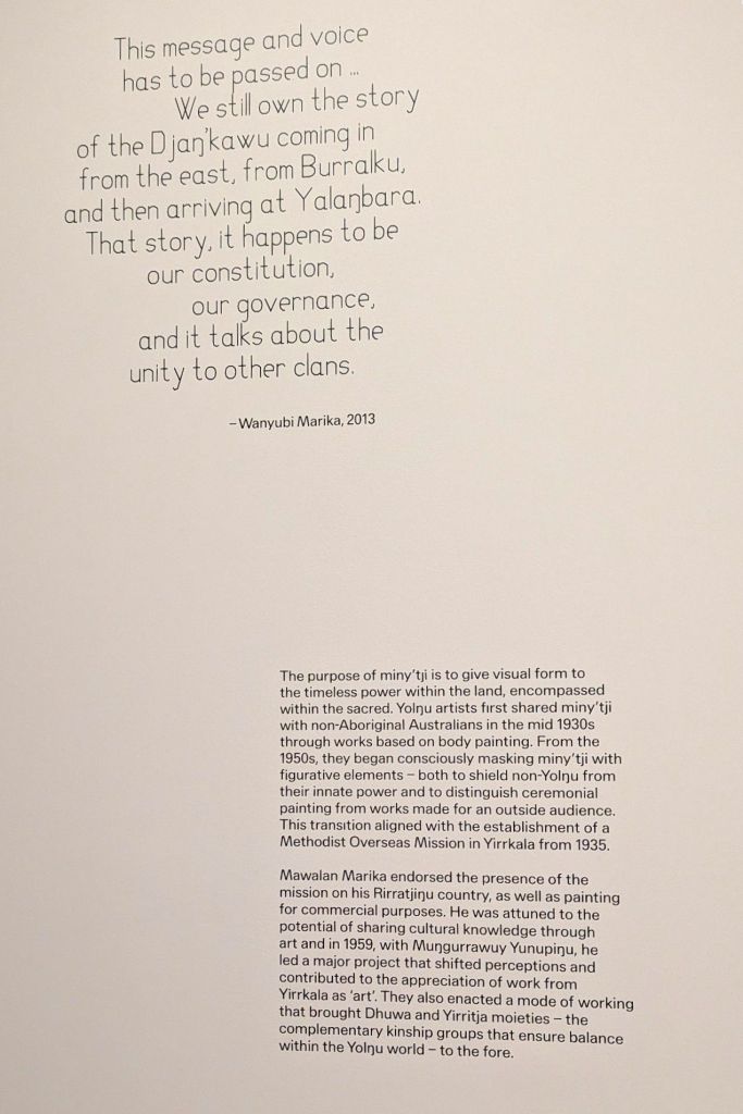 After a short walk around the permanent exhibitions, we walked across to the new gallery where the Yolŋu power the art of Yirrkala is exhibited. This gallery is beautifully lit and a fitting site for the sublime exhibition we were so fortunate to be able to visit. If I am in Sydney again before it closes, another viewing would be wonderful.
