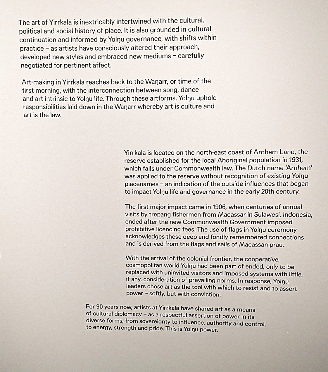 ‘For almost 100 years artists at Yirrkala have shared art as a means of cultural diplomacy – as a respectful assertion of power in its diverse forms, from sovereignty to influence, authority and control, to energy, strength and pride.