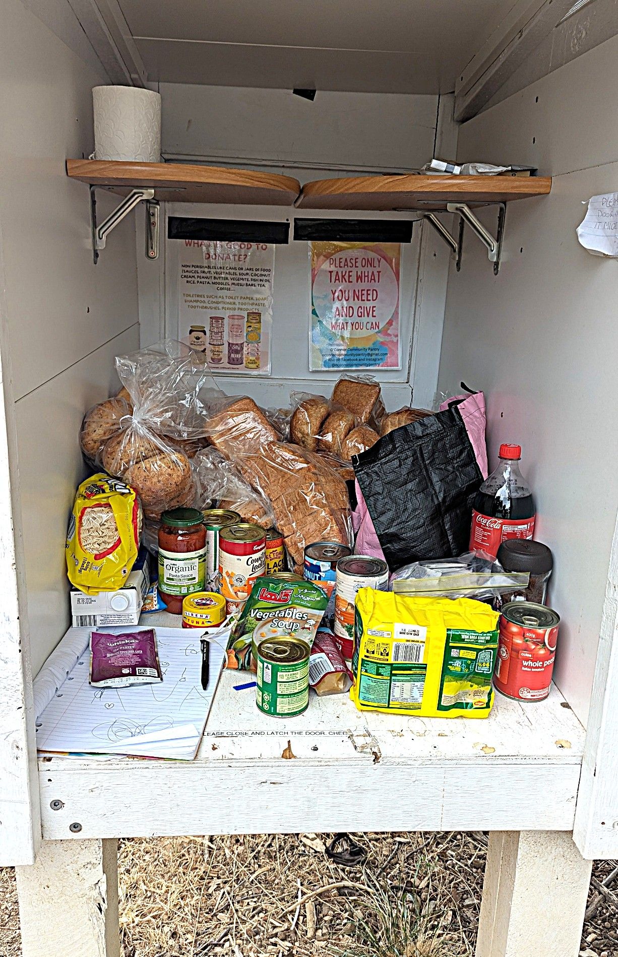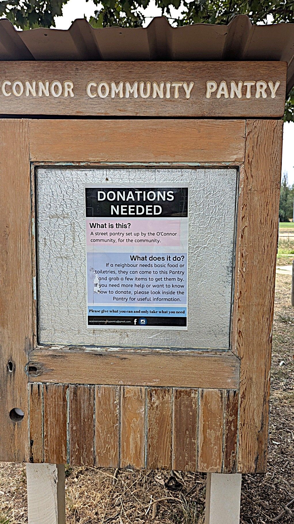 This is a great innovation, with community pantries now appearing in several suburbs. The bread that can be seen in this one, in O’Connor, comes from a bakery in Curtin. The other goods are brought to the pantry by members of the community. People make notes in the book provided, including thanks for supplying items and suggestions as to what would be appreciated and appropriate.