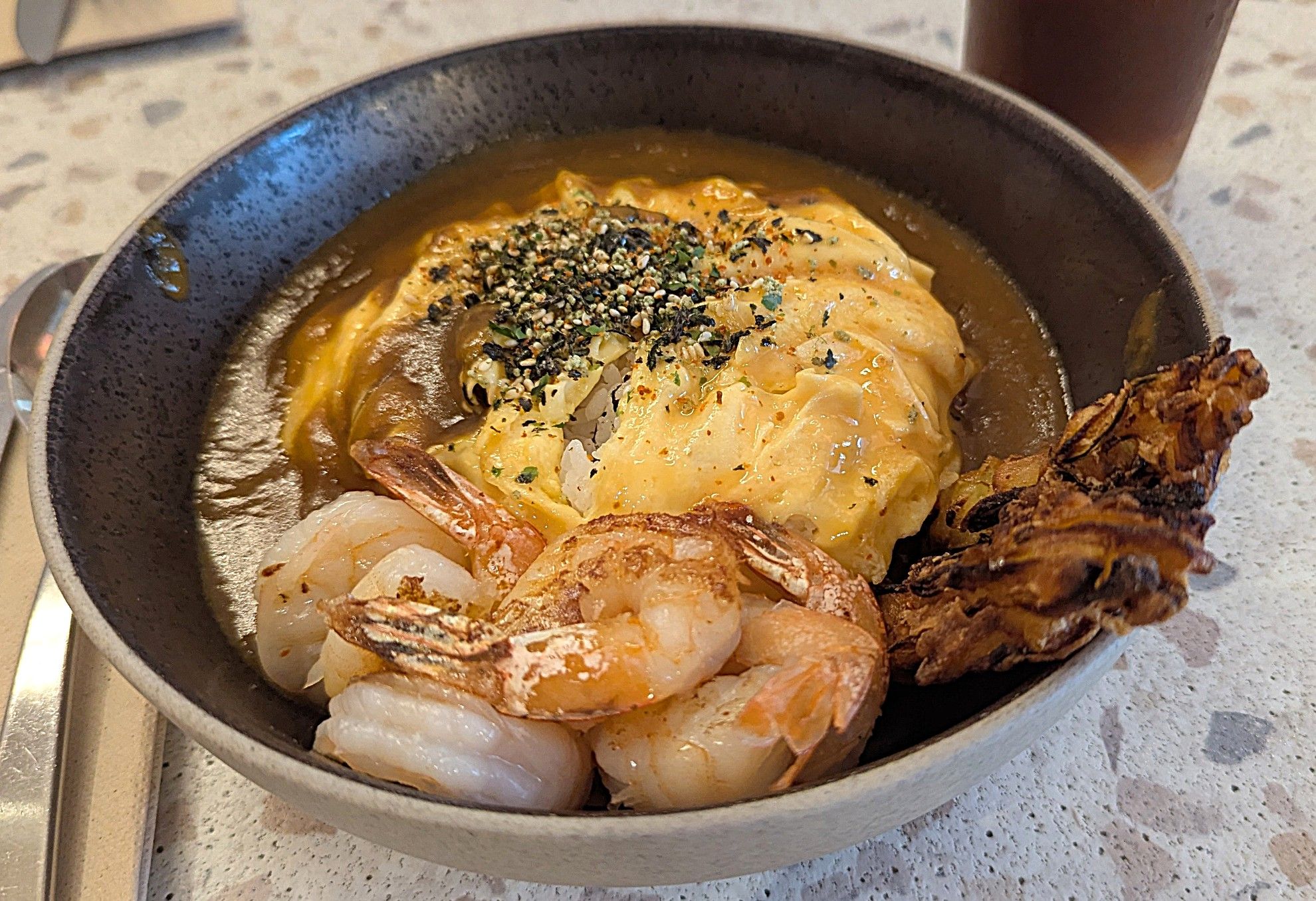 Super Sweet has indoor and outdoor seating, most of which was filled when we lunched there on Monday. On an earlier occasion we have had some very pleasant coffees, but the cool drinks were very tempting on a hot day. We had an iced yuzu lemonade and a yuzu lemonade espresso. The Shakshuka was very good, and the Katsu curry bowl with prawns was delicious.