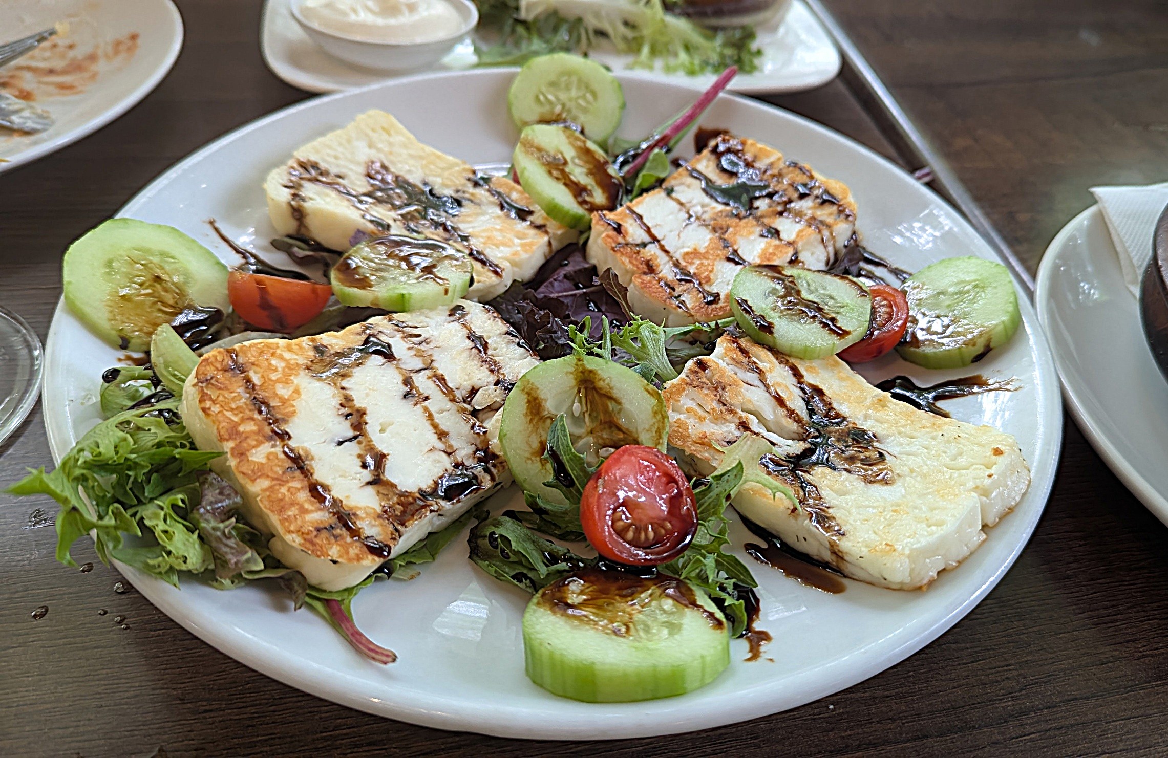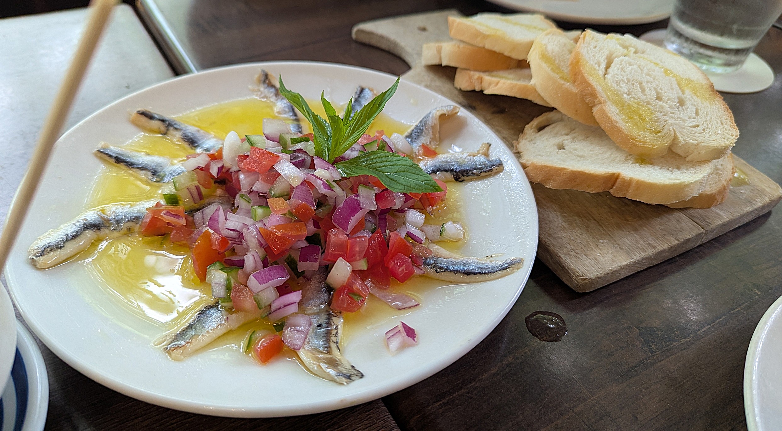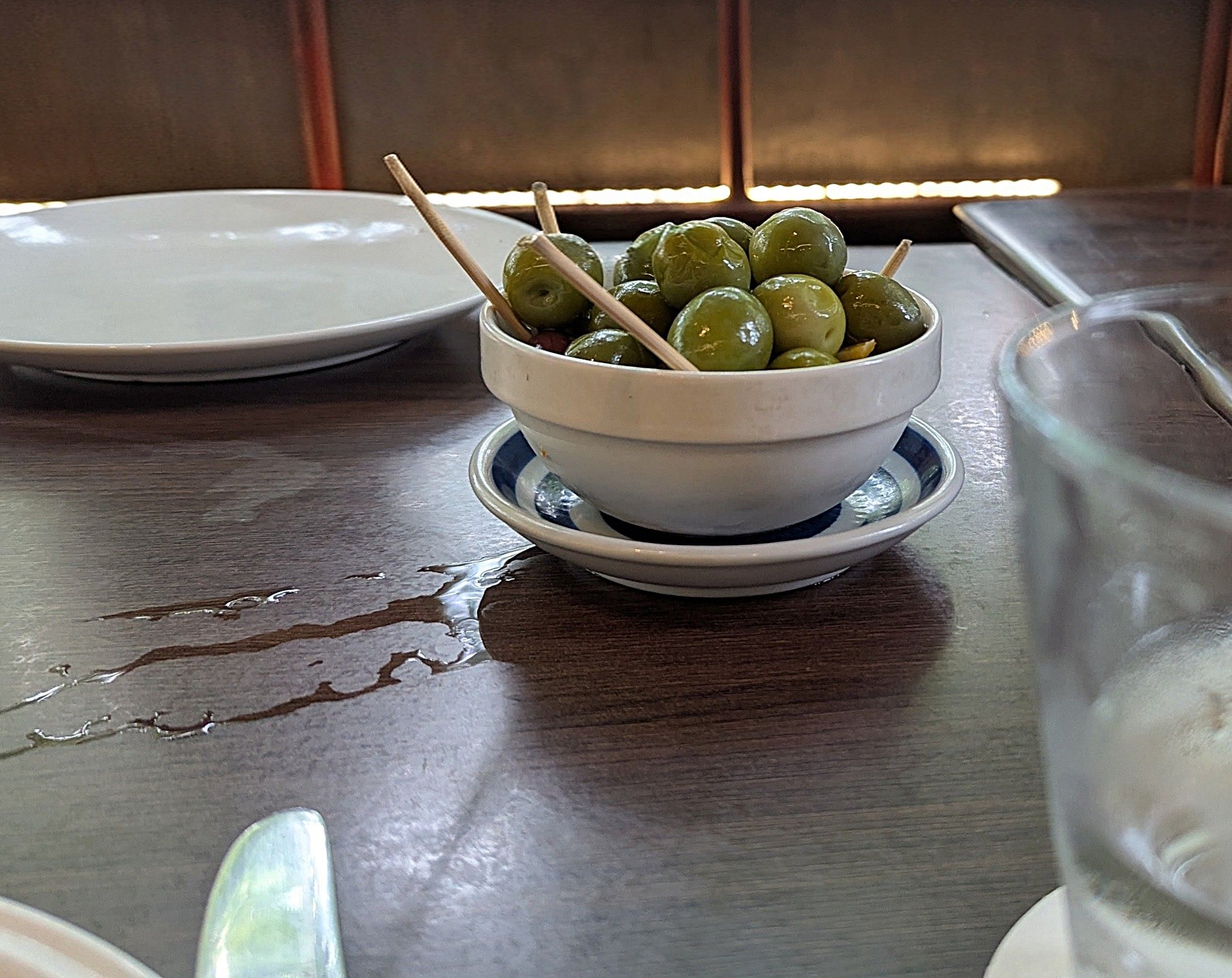 Delicado is a wonderful venue, with outdoor seating protected from the elements – no floods around our feet, although the day was gloomy and it rained just after we finished lunch. The menu is extensive, and the service friendly. We had 7 tapas dishes – one too many, but each was a pleasant contribution to a great lunch with friends. Some items were particularly delicious. The whitebait was a standout, the patatas gravas large and flavoursome, the croquettes and arancini accompanied by pleasant dips and salad. The haloumi was a generous and filling dish, nicely resented and very good indeed. Black and green olives were numerous. The albondigas was in a tasty enough sauce but the meatballs could have been smaller.