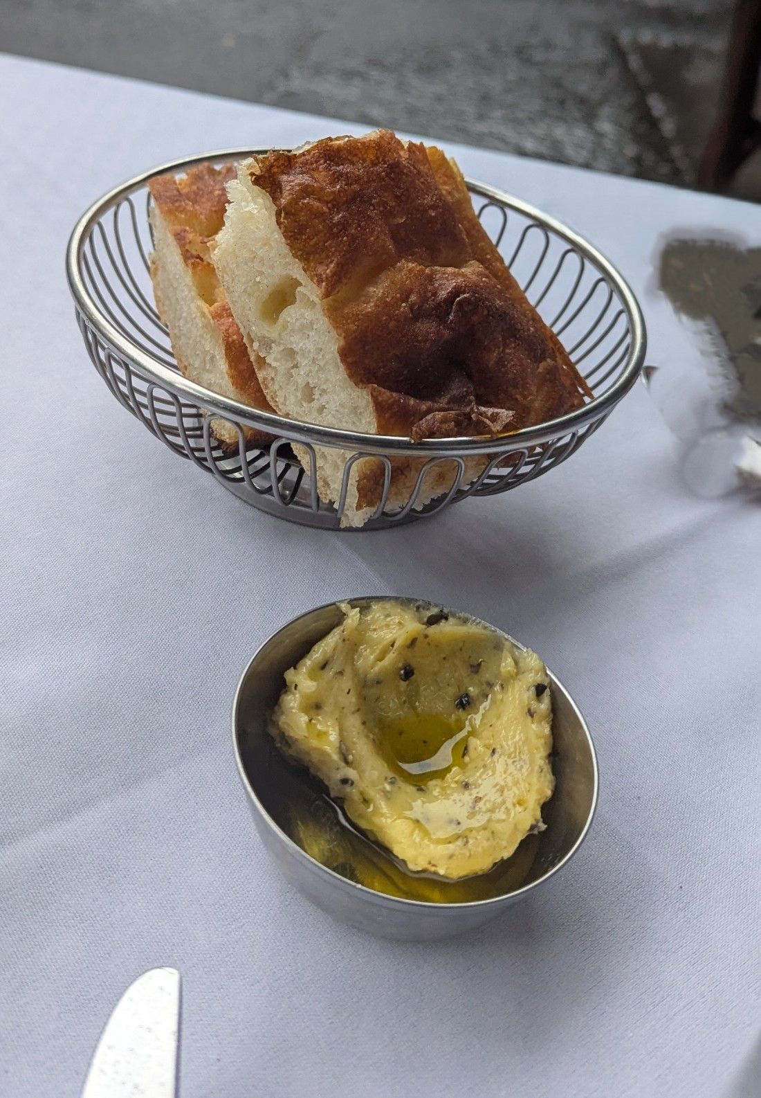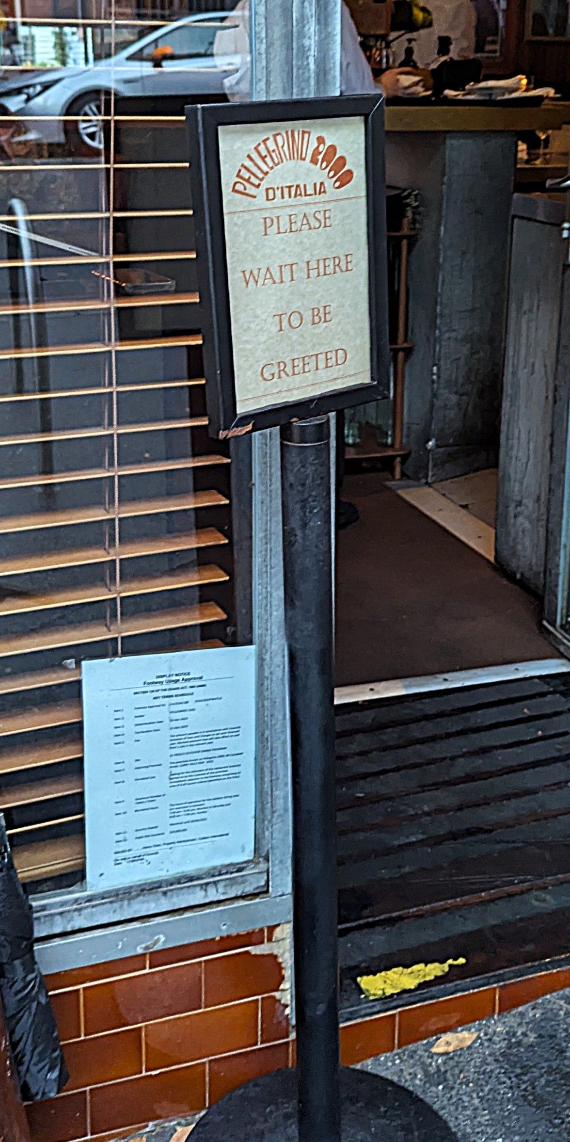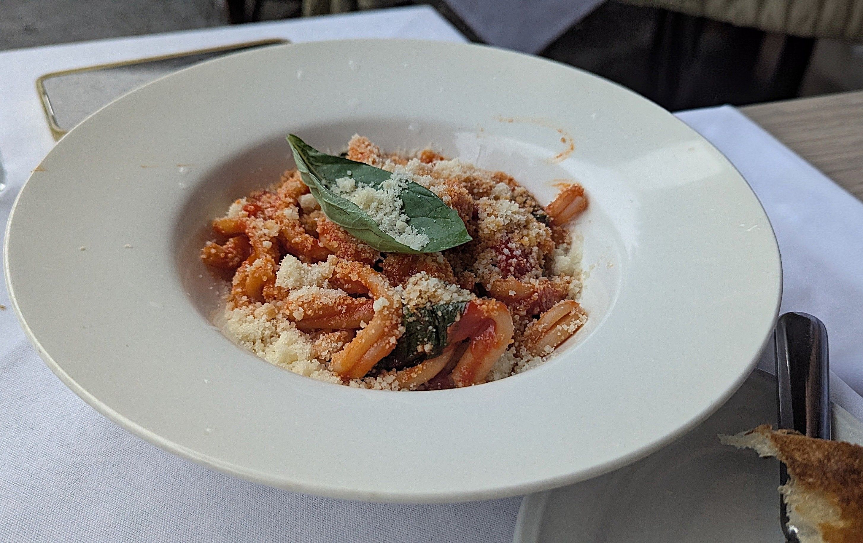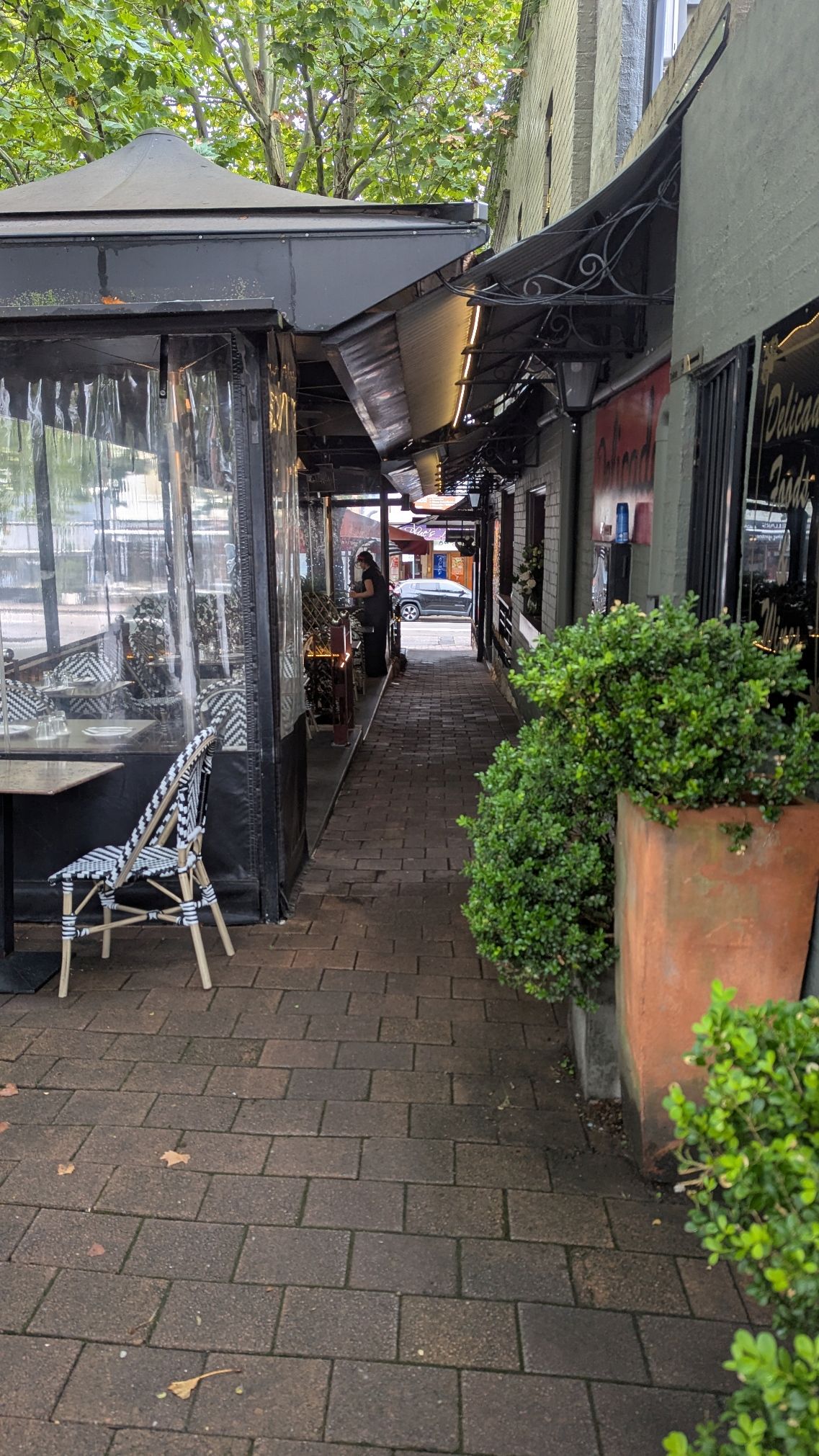 Our first meal in Sydney was accompanied by a walk to the close by Pellegrino, an Italian restaurant of good repute. As we had not booked, and the restaurant was full inside, we decided to chance the possibility of rain – and were happy to sit outside. The good reputation was borne out by the pleasant service, accomplished by a waiter who ventured through the rain to ensure our comfort and enjoyment of the food. We ended up in an island of water, eating delicious hot focaccia and the accompanying truffle, parmesan butter, followed by very good pastas. The Pomodoro sauce was pronounced excellent, and my ravioli were filled to the brim with prawns. The brown butter sage sauce was plentiful and flavoursome. Good coffees completed a very good meal, followed by a walk through the torrents which was only accomplished by removing our shoes – a rather bohemian beginning to my birthday weekend away.