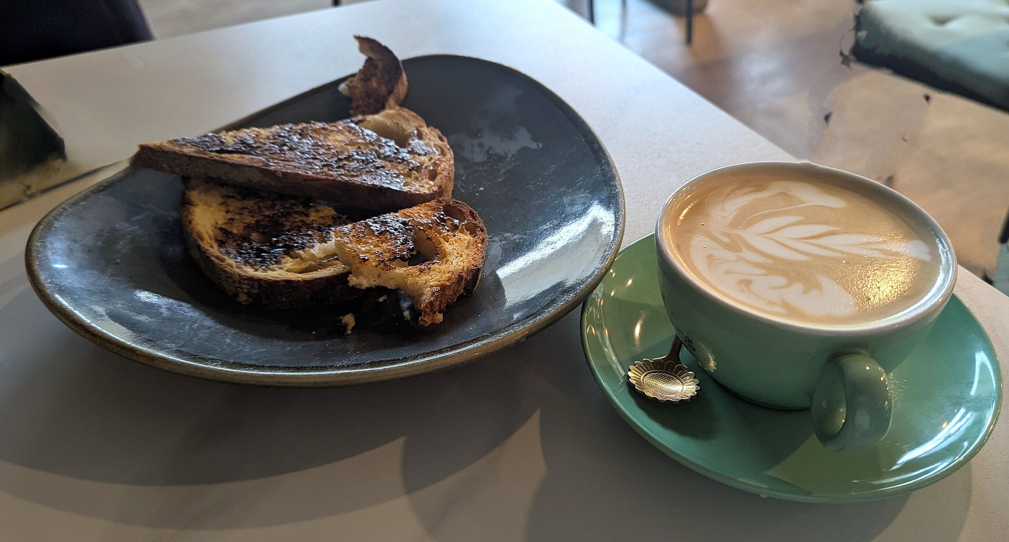 Toast and vegemite for breakfast at our usual coffee place close by – Eight Ounce Café