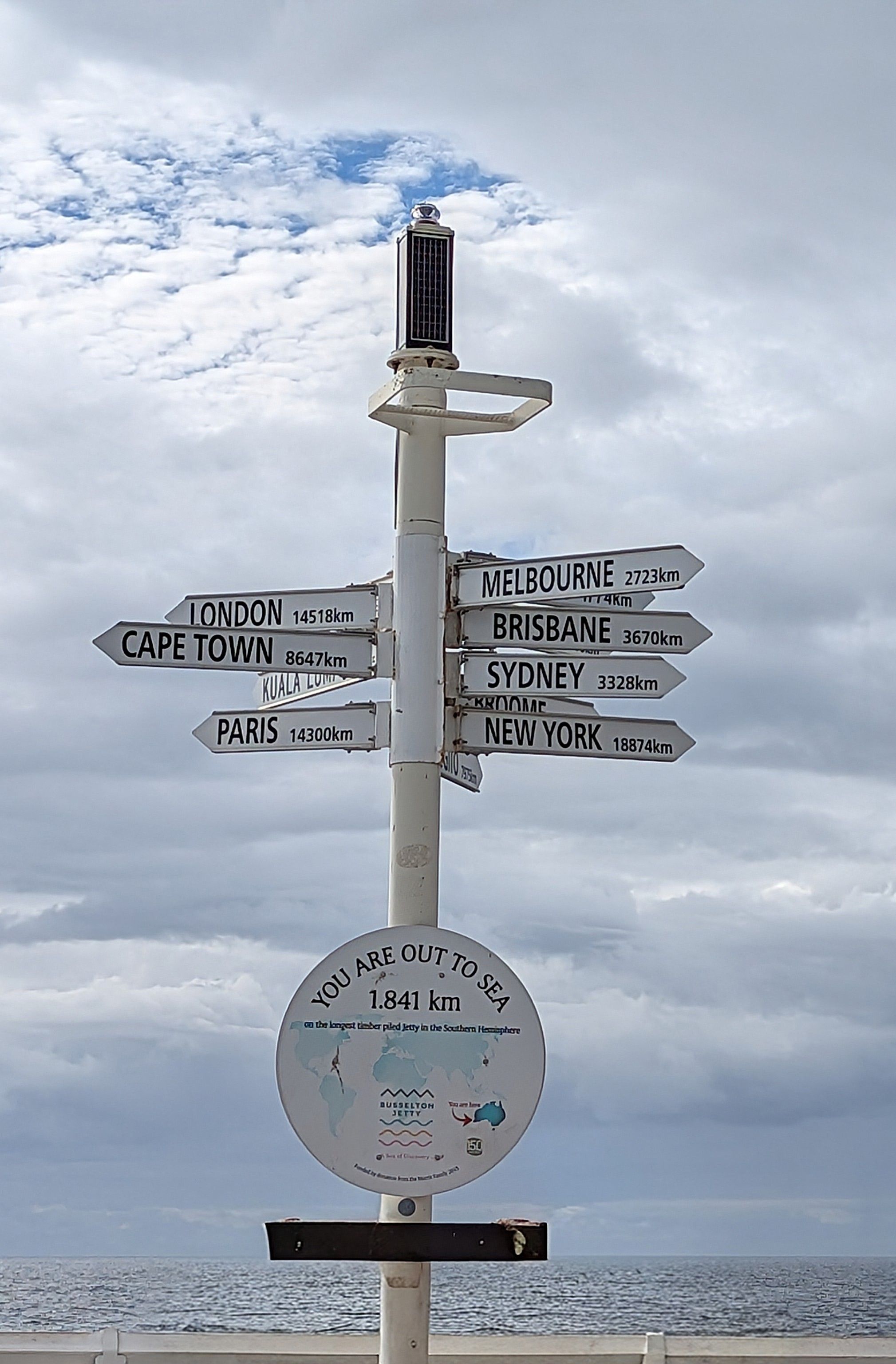 Looking towards the shore – the hotel at which we stayed and at the end of the jetty a distinctive signpost. I am now searching flights to London.