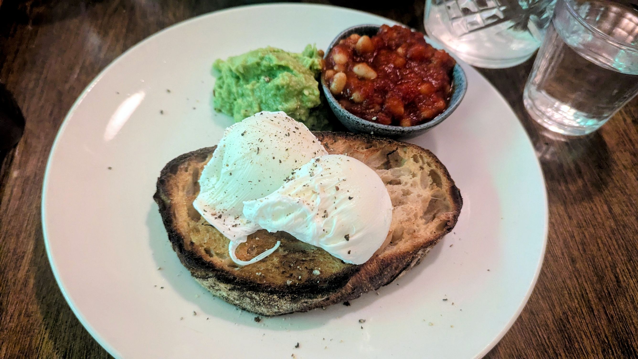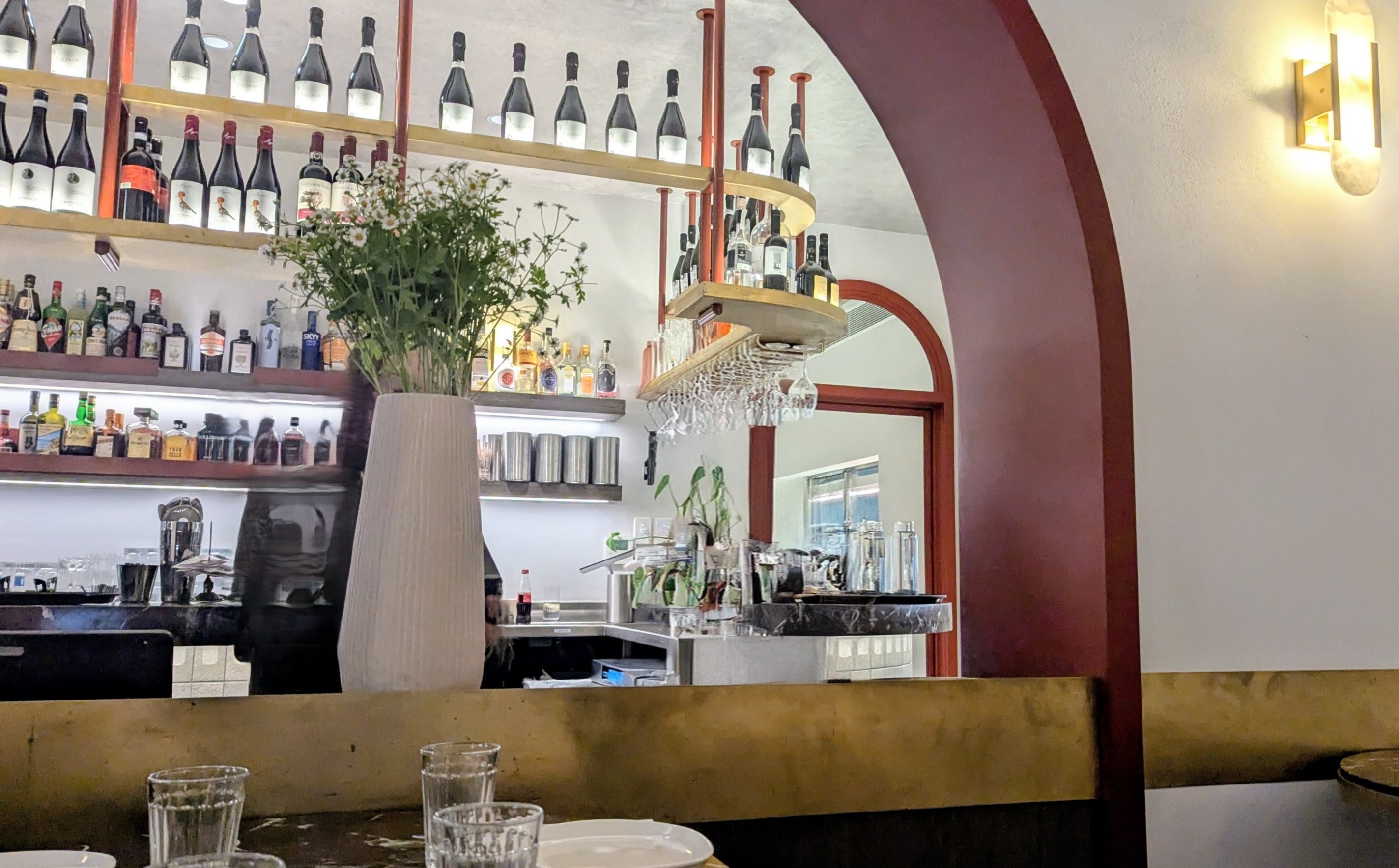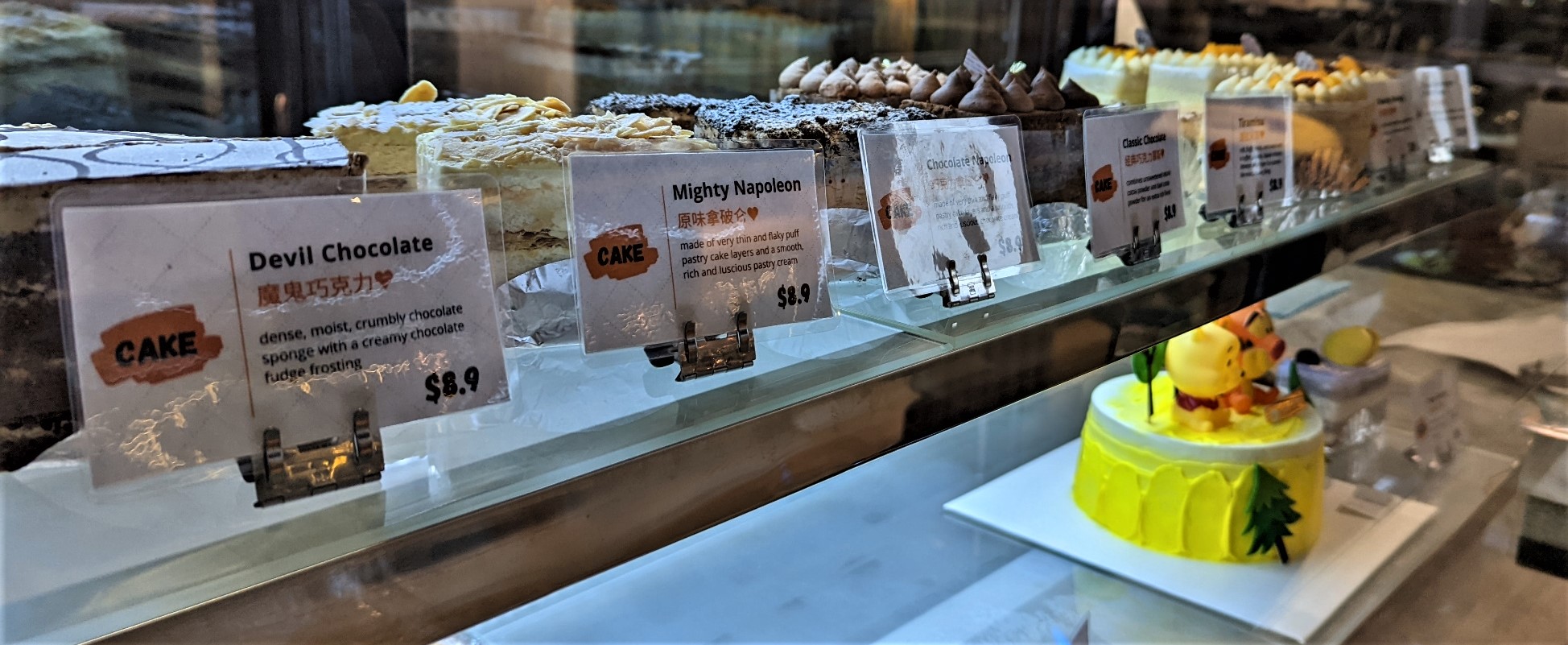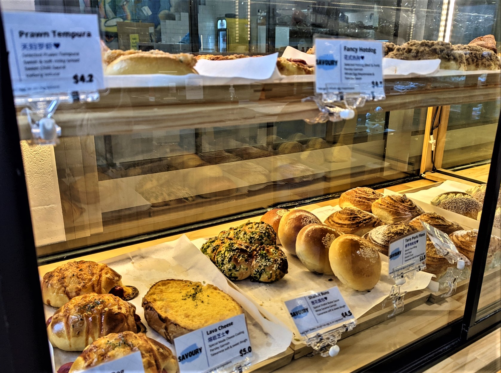 Simple seating, trays and tongs for collecting your bread, pleasant coffee in a takeaway cup – a nice place to wait for your takeaway.