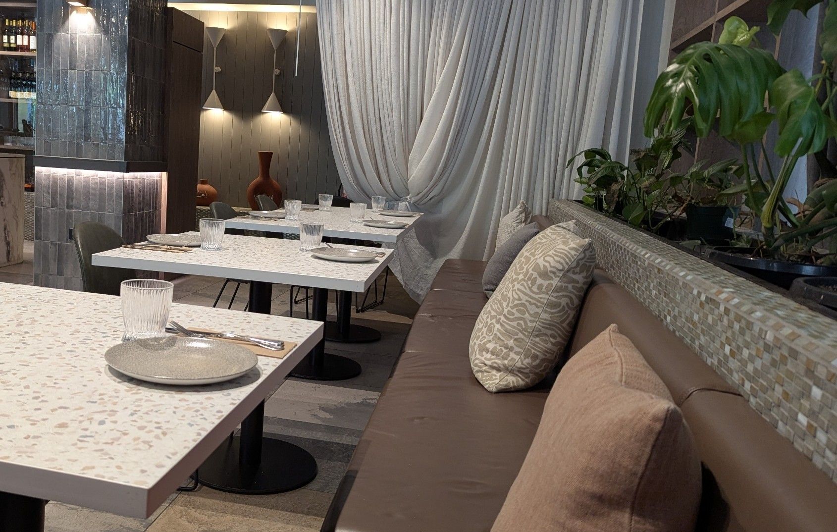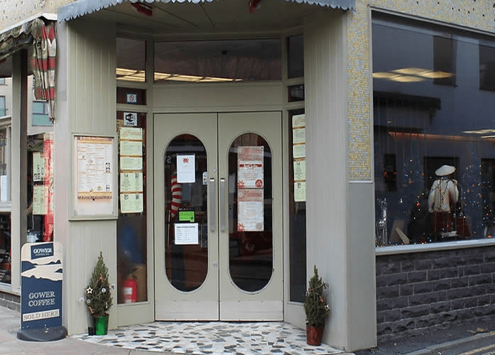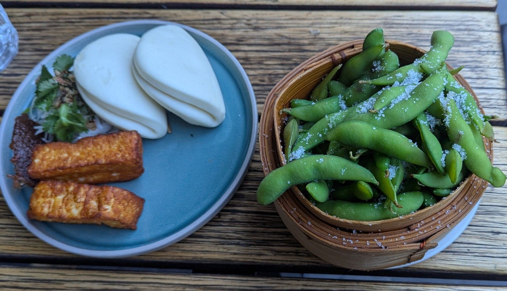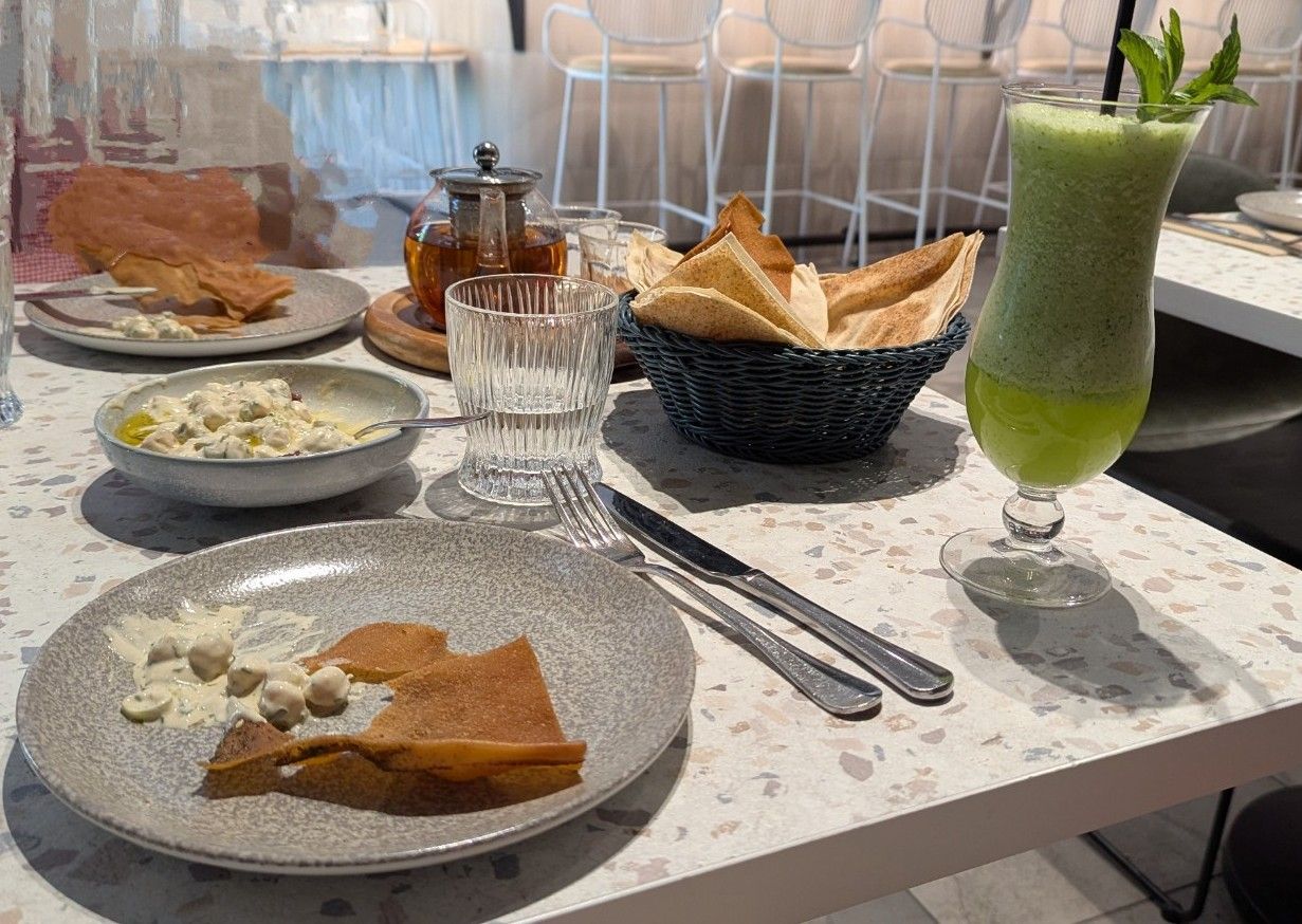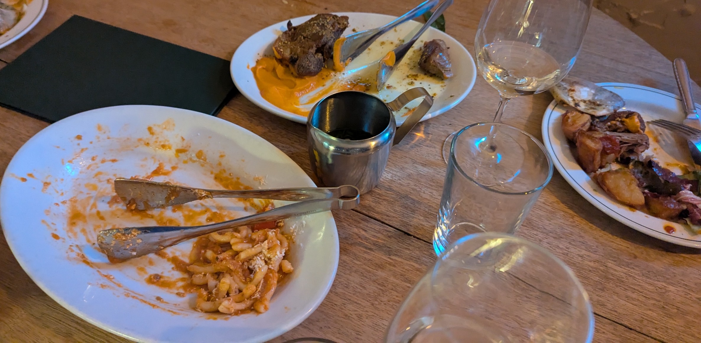 Simple seating, trays and tongs for collecting your bread, pleasant coffee in a takeaway cup – a nice place to wait for your takeaway.