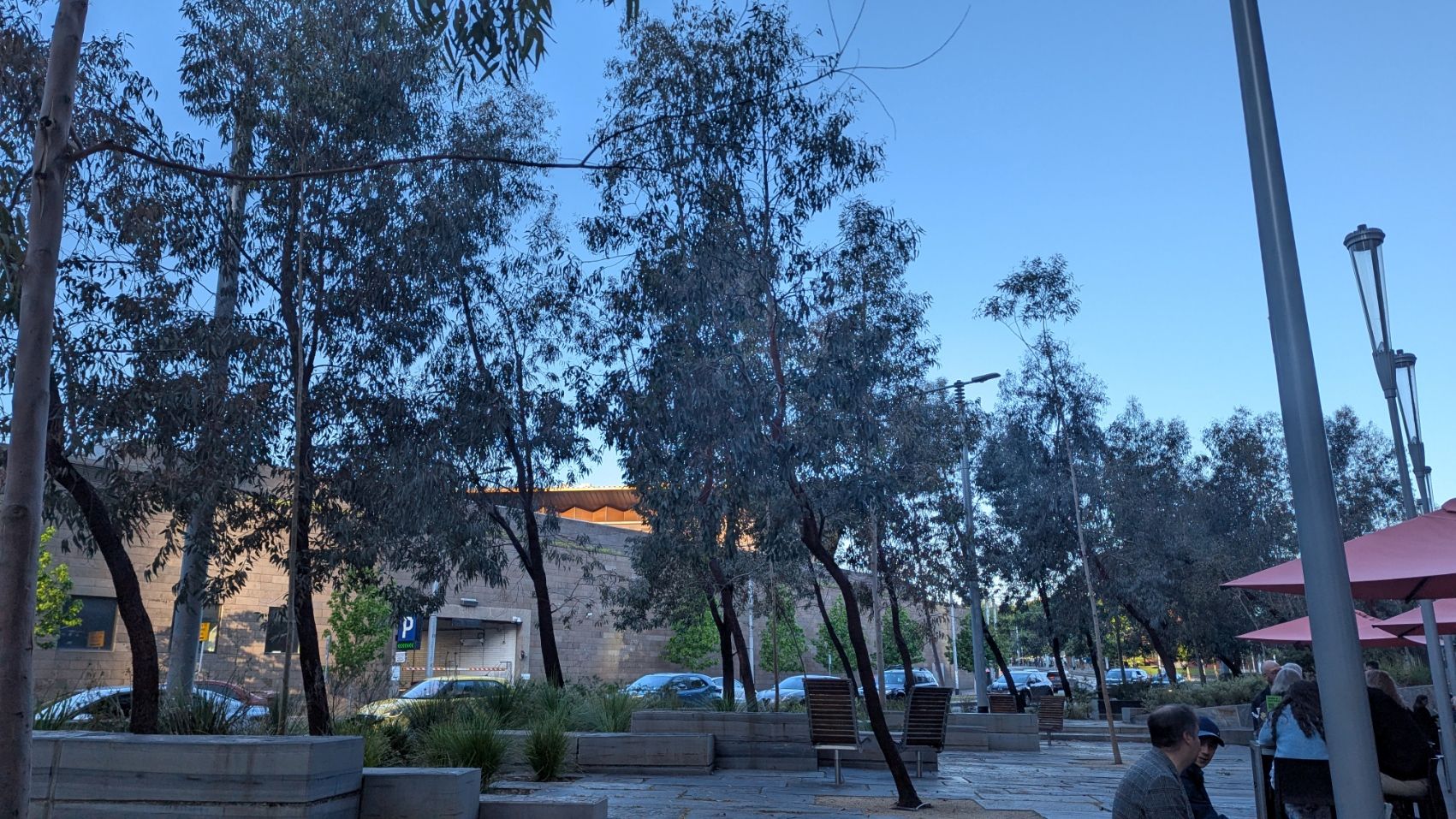 Parrots in a tree, seen from my balcony, on a Canberra winter’s day.