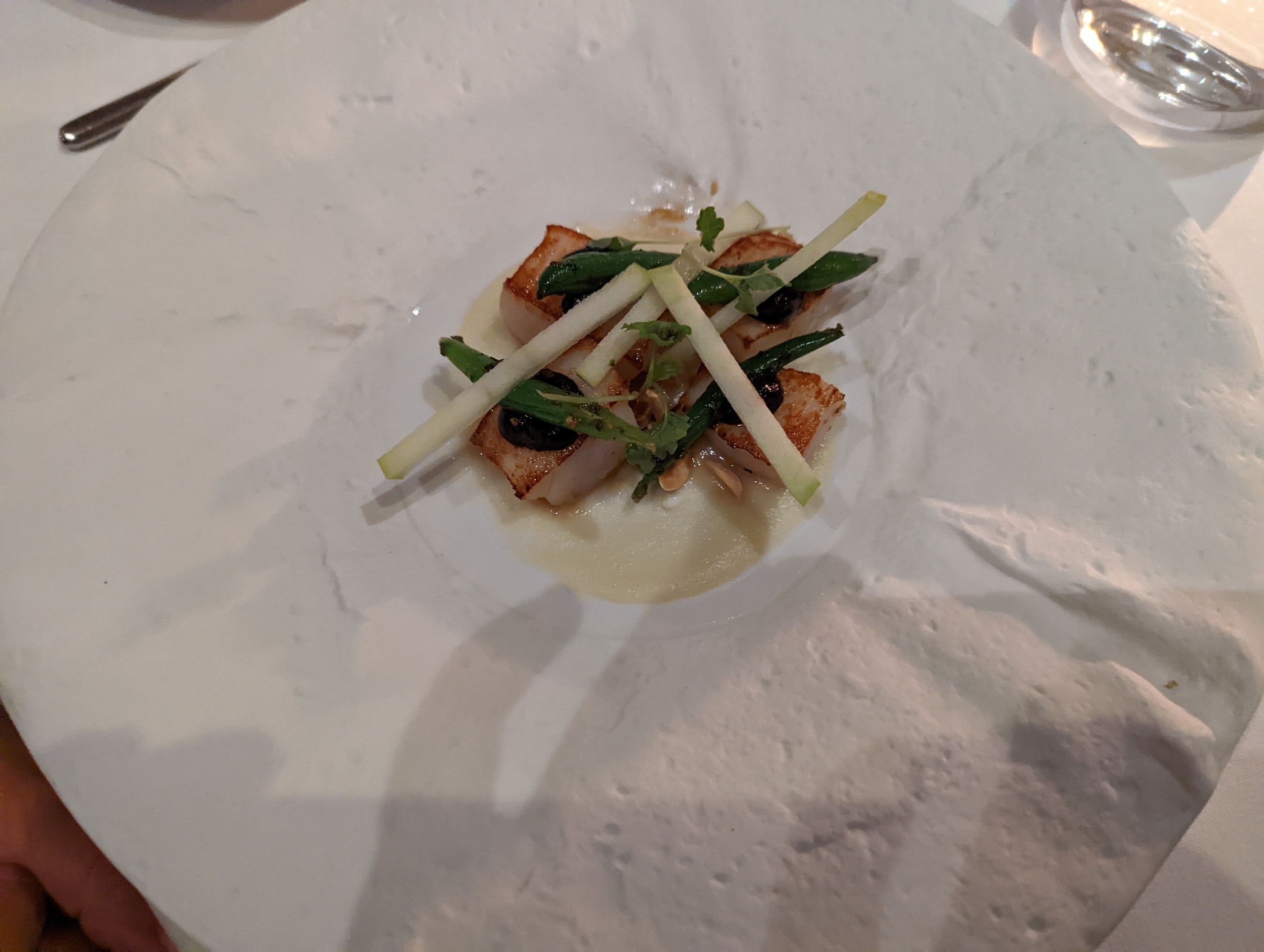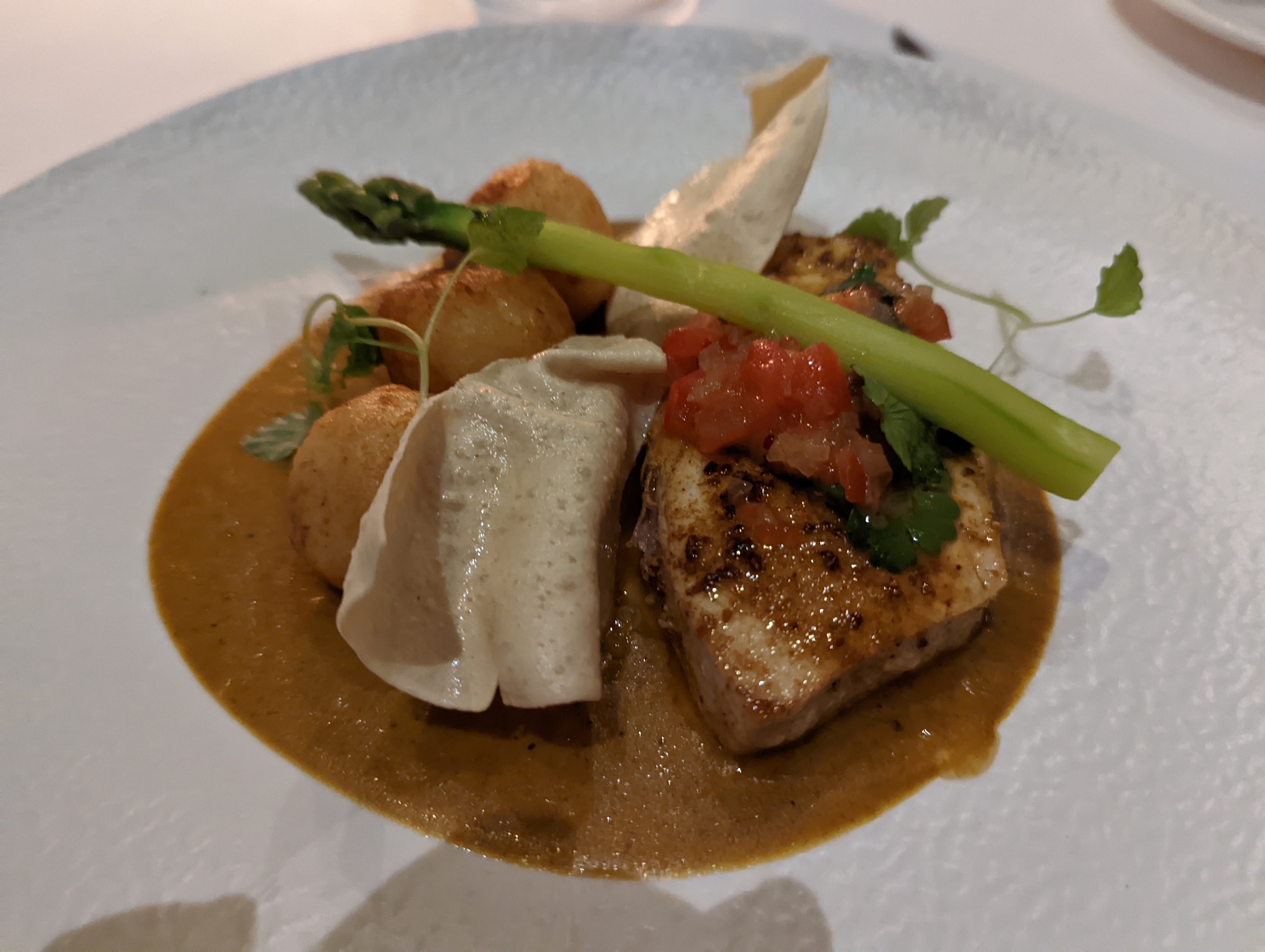 The Mad Bishop and Bear pub, upstairs at Paddington Station, is another casual eating place, with the normal pub menu. Fish and chips and sausages and mash, for example, and of course, the pub pie. The red pepper soup, although rather clumsily placed on the table, was served with a smile. It was very good indeed, although the accompanying bread was rather dreary. The Koftas were served nicely, with yoghurt and flat bread. Chips at this venue are excellent.